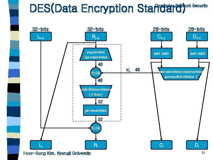 DES(Data Encryption Standard) Computer Network Security 64 -bits plaintext 56 -bits key Initial permutation Permuted choice 1 Round 1 K 1 Permuted choice 2 Left circular shift Round 2 K 2 Permuted choice 2 Left circular shift Round 16 K 3 Permuted choice 2 Left circular shift 32 -bit swap Inverse IP 64 -bits ciphertext Hyun-Sung Kim, Kyungil University 30