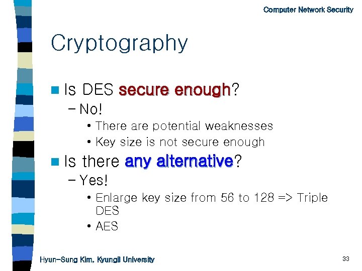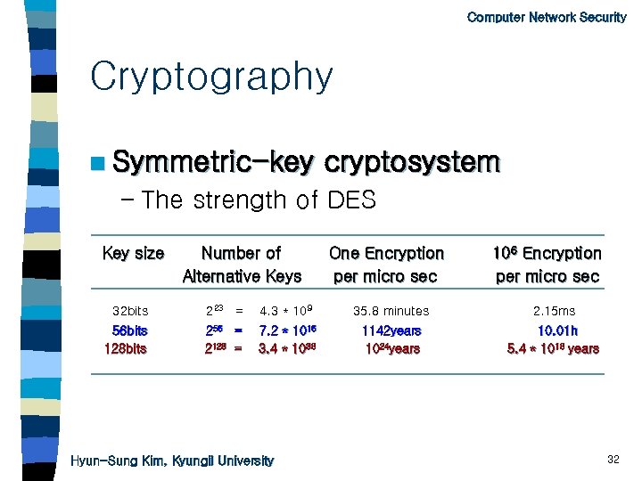 Computer Network Security Cryptography n Symmetric-key cryptosystem – The strength of DES Key size Number of Alternative Keys One Encryption per micro sec 106 Encryption per micro sec 32 bits 223 = 4. 3 * 109 35. 8 minutes 2. 15 ms 56 bits 128 bits 256 = 2128 = 7. 2 * 1016 3. 4 * 1038 1142 years 1024 years 10. 01 h 5. 4 * 1018 years Hyun-Sung Kim, Kyungil University 32