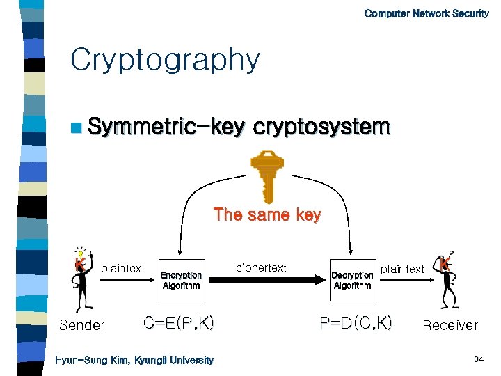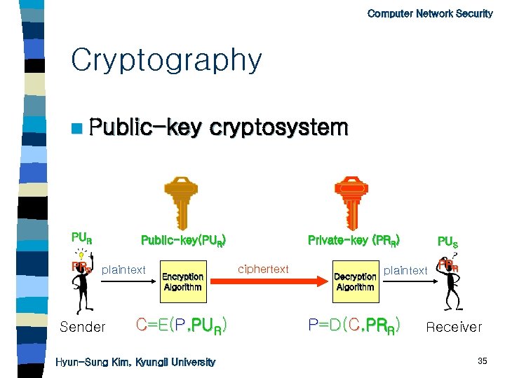 Computer Network Security Cryptography n Symmetric-key cryptosystem The same key K plaintext Sender Encryption Algorithm C=E(P, K) Hyun-Sung Kim, Kyungil University ciphertext Decryption Algorithm plaintext P=D(C, K) K Receiver 34