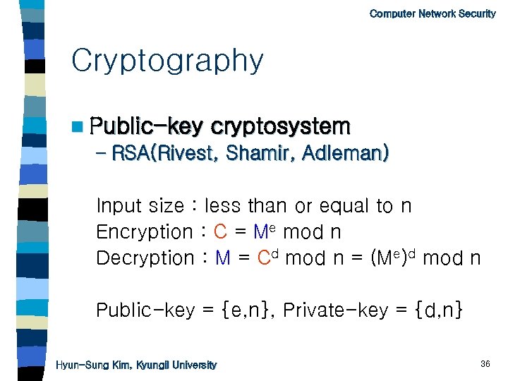 Computer Network Security Cryptography n Public-key PUR Public-key(PUR) PRS plaintext Sender cryptosystem Encryption Algorithm C=E(P, PUR) Hyun-Sung Kim, Kyungil University Private-key (PRR) ciphertext Decryption Algorithm PUS plaintext P=D(C, PRR) PRR Receiver 35