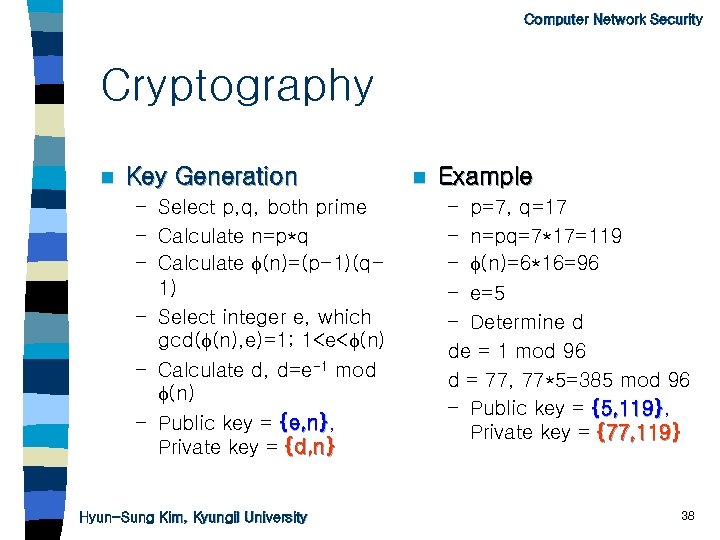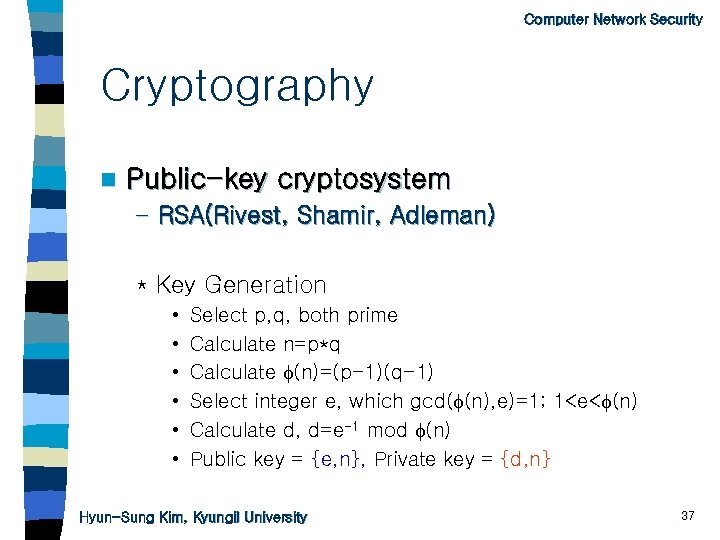 Computer Network Security Cryptography n Public-key cryptosystem – RSA(Rivest, Shamir, Adleman) Input size : less than or equal to n Encryption : C = Me mod n Decryption : M = Cd mod n = (Me)d mod n Public-key = {e, n}, Private-key = {d, n} Hyun-Sung Kim, Kyungil University 36