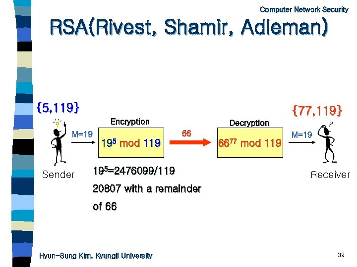 Computer Network Security RSA(Rivest, Shamir, Adleman) {5, 119} {77, 119} Encryption M=19 Sender Decryption 66 195 mod 119 195=2476099/119 6677 mod 119 M=19 Receiver 20807 with a remainder of 66 Hyun-Sung Kim, Kyungil University 39