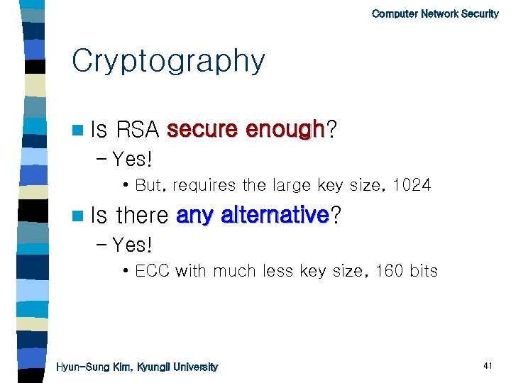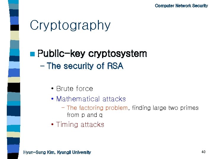 Computer Network Security Cryptography n Public-key cryptosystem – The security of RSA • Brute force • Mathematical attacks – The factoring problem, finding large two primes from p and q • Timing attacks Hyun-Sung Kim, Kyungil University 40