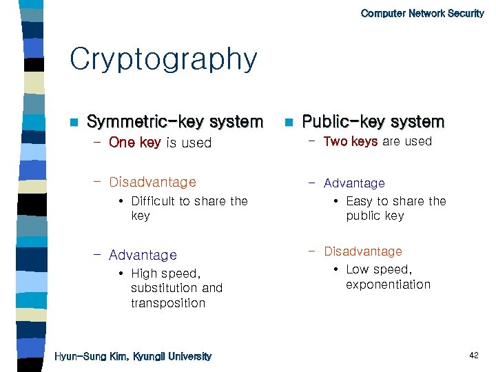 Computer Network Security Cryptography n Symmetric-key system n Public-key system – One key is used – Two keys are used – Disadvantage – Advantage • Easy to share the public key • Difficult to share the key – Advantage • High speed, substitution and transposition Hyun-Sung Kim, Kyungil University – Disadvantage • Low speed, exponentiation 42