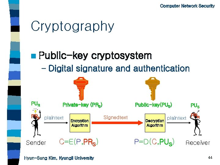 Computer Network Security Cryptography n Public-key cryptosystem – Digital signature and authentication PUR Private-key (PRS) PRS plaintext Sender Encryption Algorithm C=E(P, PRS) Hyun-Sung Kim, Kyungil University Public-key(PUS) Signedtext Decryption Algorithm PUS plaintext P=D(C, PUS) PRR Receiver 44
