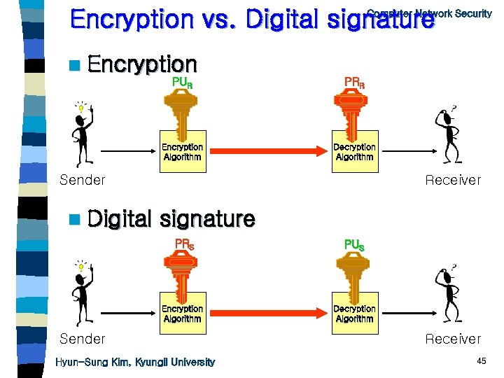 Encryption vs. Digital signature Computer Network Security n Encryption PUR PRR Encryption Algorithm Decryption Algorithm Sender n Digital Receiver signature PRS PUS Encryption Algorithm Decryption Algorithm Sender Hyun-Sung Kim, Kyungil University Receiver 45
