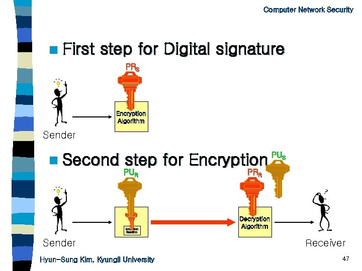 Computer Network Security n First step for Digital signature PRS Encryption Algorithm Sender n Second step for Encryption PUR Encryption Algorithm Sender Hyun-Sung Kim, Kyungil University PUS PRR Decryption Algorithm Receiver 47