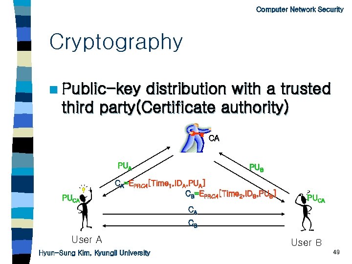 Computer Network Security Cryptography n Public-key distribution with a trusted third party(Certificate authority) CA PUCA PUB CA=EPRCA[Time 1, IDA, PUA] CB=EPRCA[Time 2, IDB, PUB] PUCA CA CB User A Hyun-Sung Kim, Kyungil University User B 49