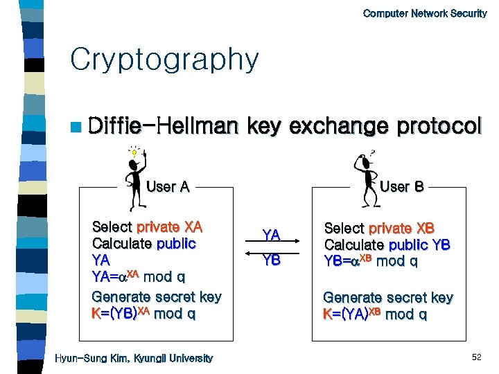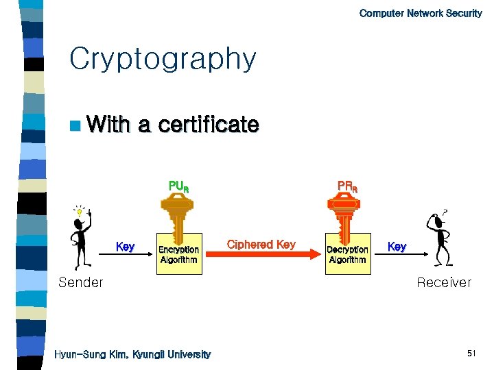 Computer Network Security Cryptography n With a certificate PUR Key Encryption Algorithm Sender Hyun-Sung Kim, Kyungil University PRR Ciphered Key Decryption Algorithm Key Receiver 51