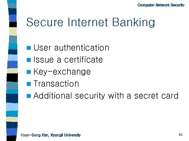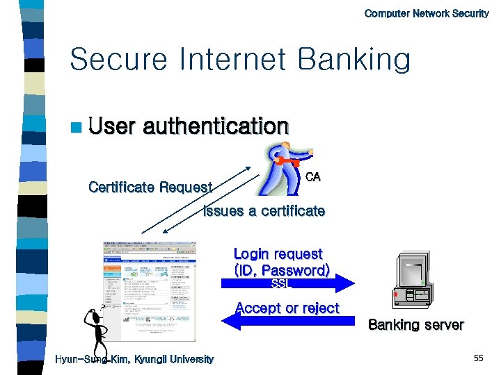 Computer Network Security Secure Internet Banking n User authentication n Issue a certificate n Key-exchange n Transaction n Additional security with a secret card Hyun-Sung Kim, Kyungil University 54