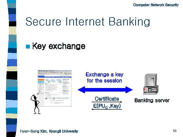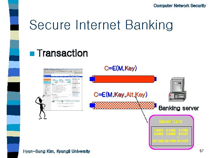 Computer Network Security Secure Internet Banking n Key exchange Exchange a key for the session Certificate E(PUC , Key) Hyun-Sung Kim, Kyungil University Banking server 56