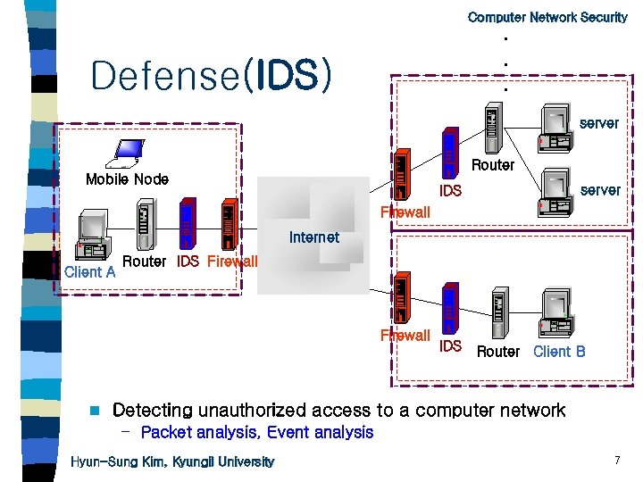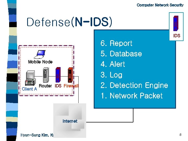 Computer Network Security . . . Defense(IDS) server Router Mobile Node server IDS Firewall Internet Client A Router IDS Firewall n IDS Router Client B Detecting unauthorized access to a computer network – Packet analysis, Event analysis Hyun-Sung Kim, Kyungil University 7