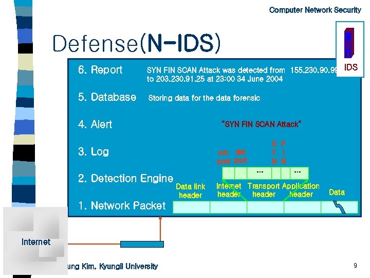 Computer Network Security Defense(N-IDS) IDS Mobile Node Client A Router IDS Firewall 6. 5. 4. 3. 2. 1. Report Database Alert Log Detection Engine Network Packet Internet Hyun-Sung Kim, Kyungil University 8