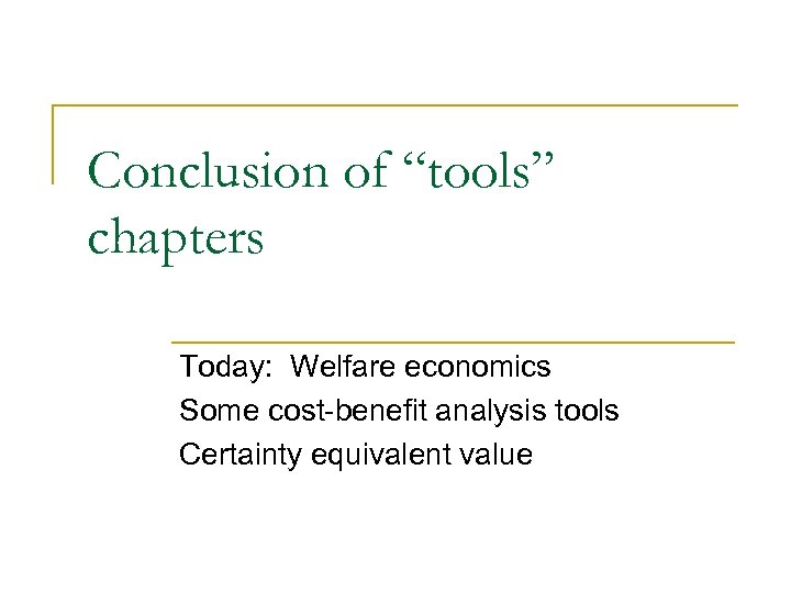 Conclusion of “tools” chapters Today: Welfare economics Some cost-benefit analysis tools Certainty equivalent value