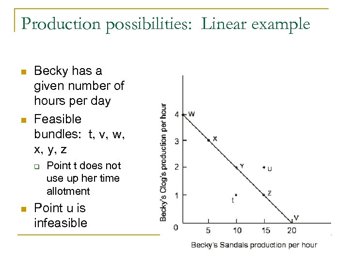 Production possibilities: Linear example n n Becky has a given number of hours per day Feasible bundles: t, v, w, x, y, z q n Point t does not use up her time allotment Point u is infeasible