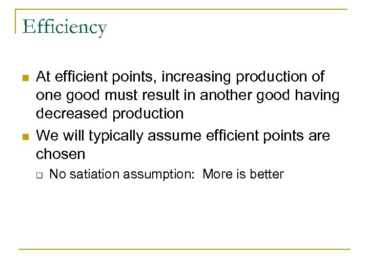 Efficiency n n At efficient points, increasing production of one good must result in another good having decreased production We will typically assume efficient points are chosen q No satiation assumption: More is better