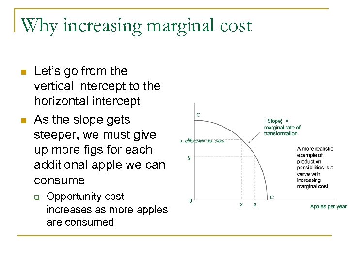 Why increasing marginal cost n n Let’s go from the vertical intercept to the horizontal intercept As the slope gets steeper, we must give up more figs for each additional apple we can consume q Opportunity cost increases as more apples are consumed