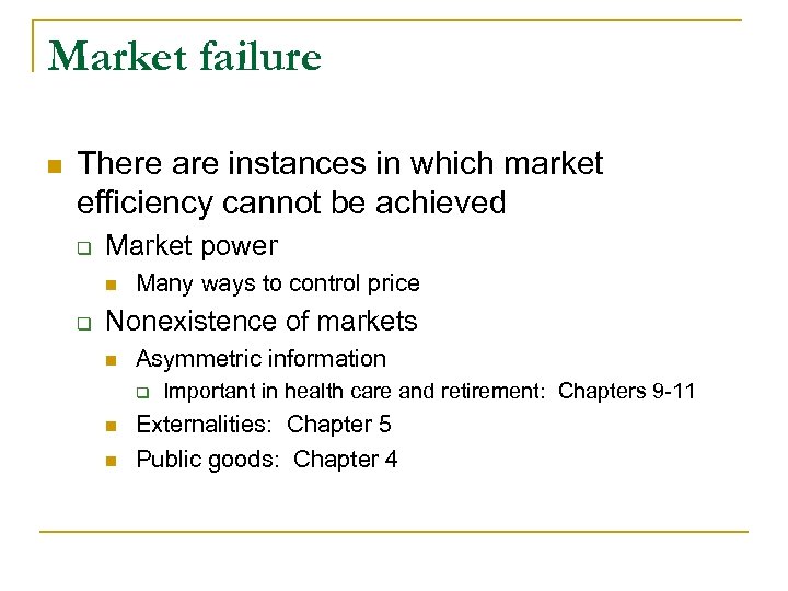 Market failure n There are instances in which market efficiency cannot be achieved q Market power n q Many ways to control price Nonexistence of markets n Asymmetric information q n n Important in health care and retirement: Chapters 9 -11 Externalities: Chapter 5 Public goods: Chapter 4