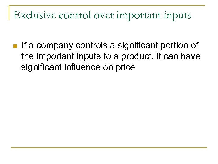 Exclusive control over important inputs n If a company controls a significant portion of the important inputs to a product, it can have significant influence on price