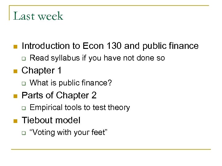 Last week n Introduction to Econ 130 and public finance q n Chapter 1 q n What is public finance? Parts of Chapter 2 q n Read syllabus if you have not done so Empirical tools to test theory Tiebout model q “Voting with your feet”