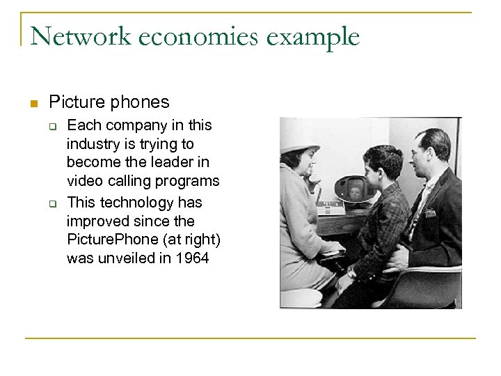 Network economies example n Picture phones q q Each company in this industry is trying to become the leader in video calling programs This technology has improved since the Picture. Phone (at right) was unveiled in 1964