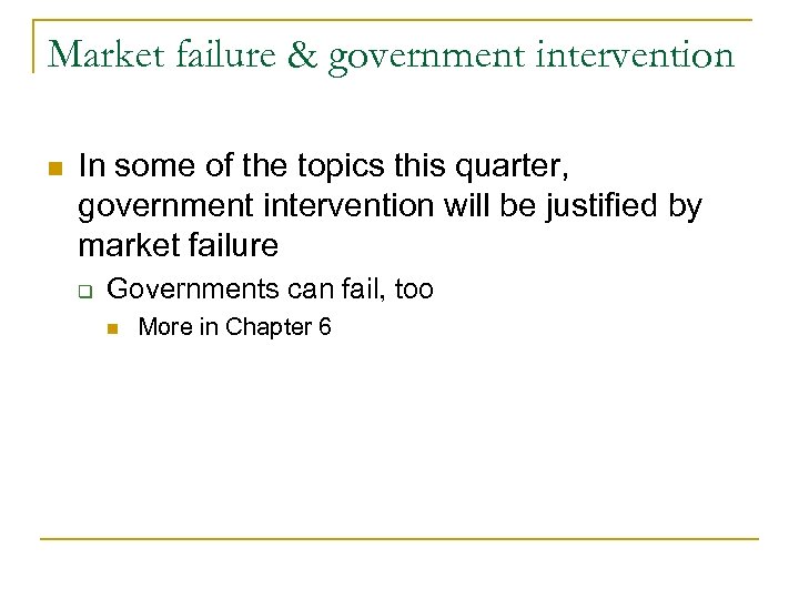Market failure & government intervention n In some of the topics this quarter, government intervention will be justified by market failure q Governments can fail, too n More in Chapter 6