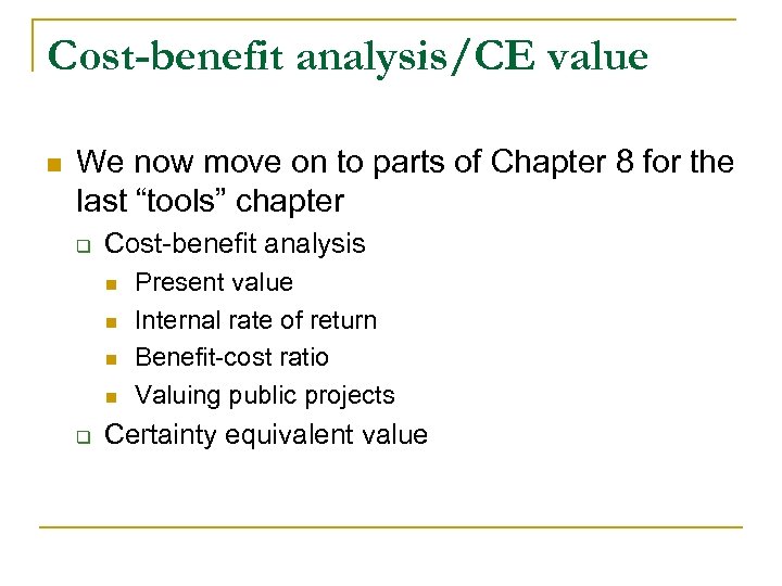 Cost-benefit analysis/CE value n We now move on to parts of Chapter 8 for the last “tools” chapter q Cost-benefit analysis n n q Present value Internal rate of return Benefit-cost ratio Valuing public projects Certainty equivalent value