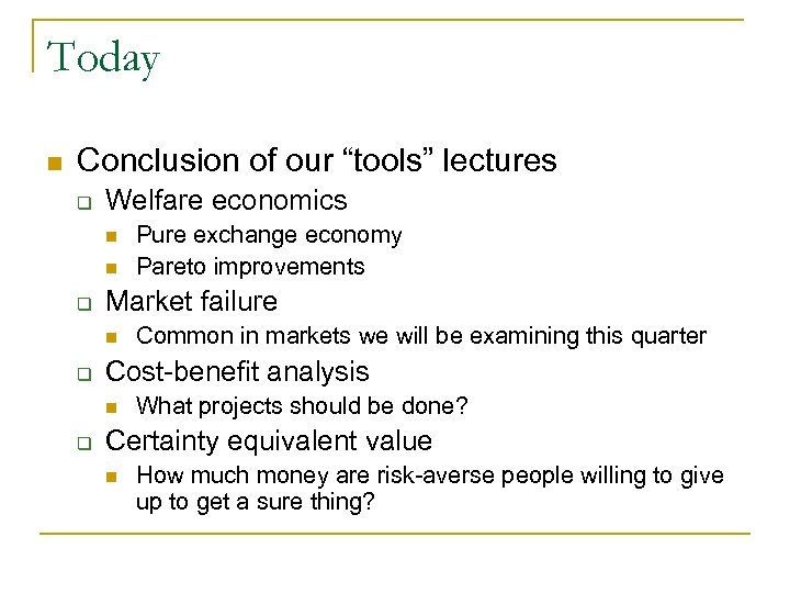 Today n Conclusion of our “tools” lectures q Welfare economics n n q Market failure n q Common in markets we will be examining this quarter Cost-benefit analysis n q Pure exchange economy Pareto improvements What projects should be done? Certainty equivalent value n How much money are risk-averse people willing to give up to get a sure thing?