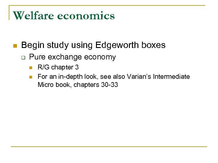 Welfare economics n Begin study using Edgeworth boxes q Pure exchange economy n n R/G chapter 3 For an in-depth look, see also Varian’s Intermediate Micro book, chapters 30 -33