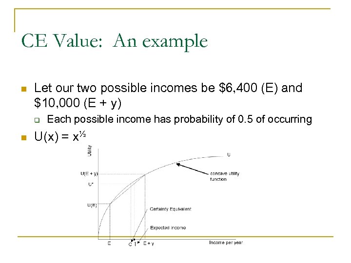 CE Value: An example n Let our two possible incomes be $6, 400 (E) and $10, 000 (E + y) q n Each possible income has probability of 0. 5 of occurring U(x) = x½