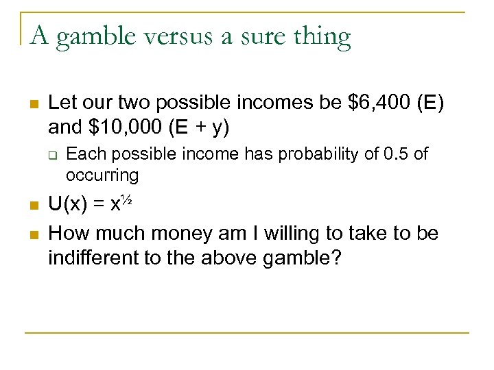 A gamble versus a sure thing n Let our two possible incomes be $6, 400 (E) and $10, 000 (E + y) q n n Each possible income has probability of 0. 5 of occurring U(x) = x½ How much money am I willing to take to be indifferent to the above gamble?