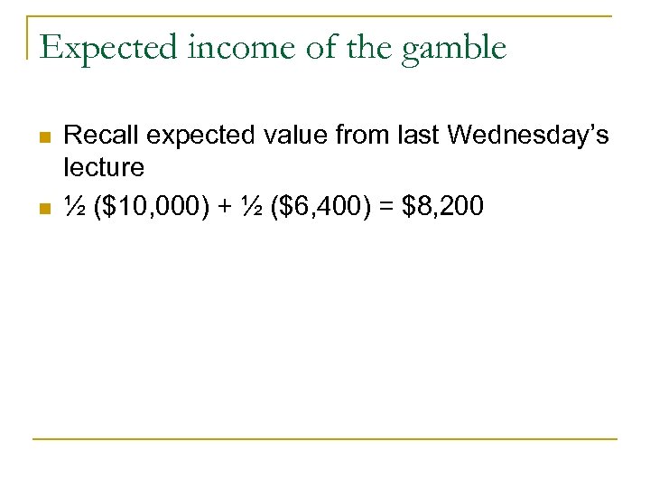 Expected income of the gamble n n Recall expected value from last Wednesday’s lecture ½ ($10, 000) + ½ ($6, 400) = $8, 200