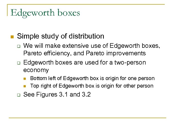 Edgeworth boxes n Simple study of distribution q q We will make extensive use of Edgeworth boxes, Pareto efficiency, and Pareto improvements Edgeworth boxes are used for a two-person economy n n q Bottom left of Edgeworth box is origin for one person Top right of Edgeworth box is origin for other person See Figures 3. 1 and 3. 2
