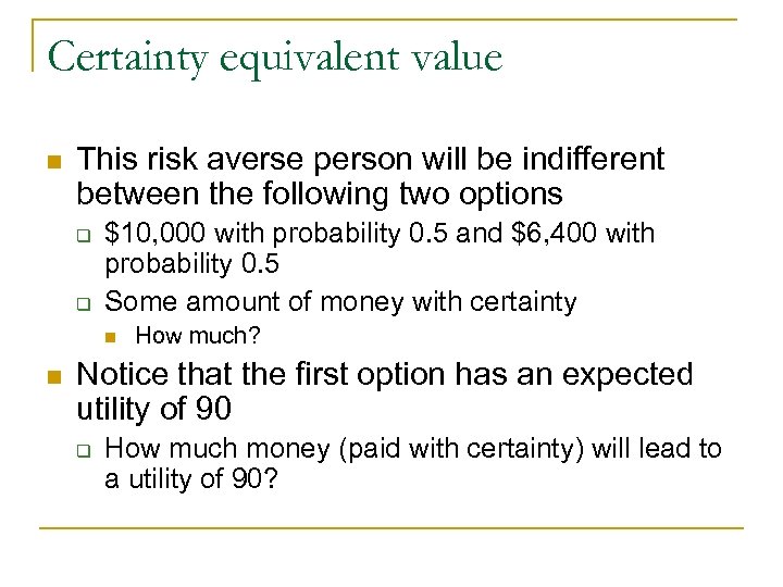 Certainty equivalent value n This risk averse person will be indifferent between the following two options q q $10, 000 with probability 0. 5 and $6, 400 with probability 0. 5 Some amount of money with certainty n n How much? Notice that the first option has an expected utility of 90 q How much money (paid with certainty) will lead to a utility of 90?