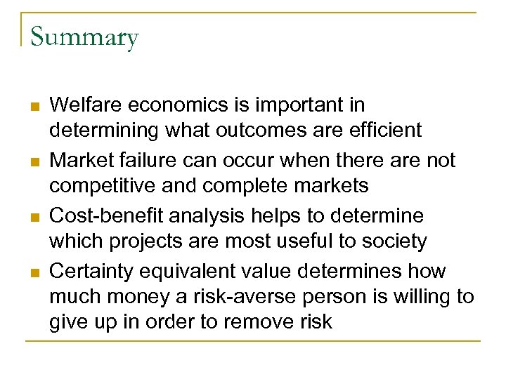 Summary n n Welfare economics is important in determining what outcomes are efficient Market failure can occur when there are not competitive and complete markets Cost-benefit analysis helps to determine which projects are most useful to society Certainty equivalent value determines how much money a risk-averse person is willing to give up in order to remove risk