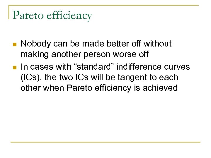 Pareto efficiency n n Nobody can be made better off without making another person worse off In cases with “standard” indifference curves (ICs), the two ICs will be tangent to each other when Pareto efficiency is achieved