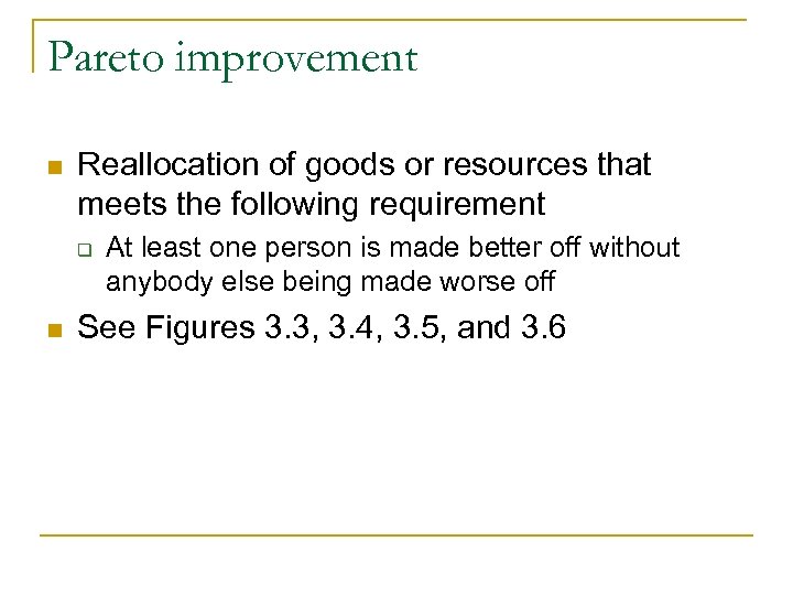 Pareto improvement n Reallocation of goods or resources that meets the following requirement q n At least one person is made better off without anybody else being made worse off See Figures 3. 3, 3. 4, 3. 5, and 3. 6