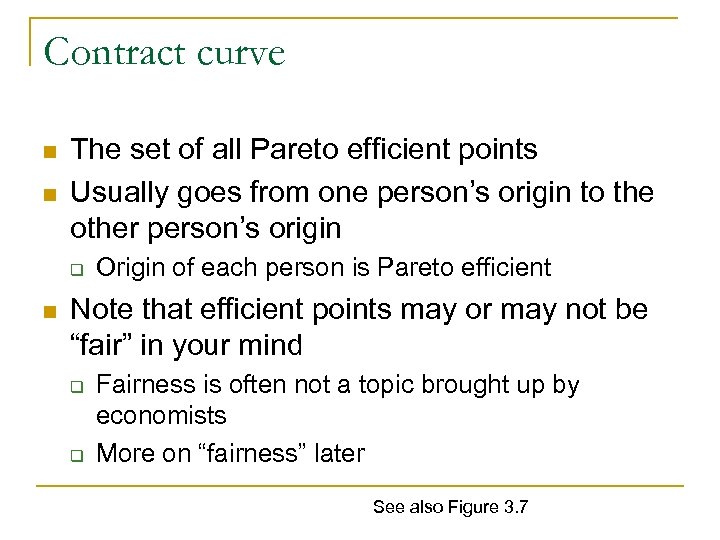 Contract curve n n The set of all Pareto efficient points Usually goes from one person’s origin to the other person’s origin q n Origin of each person is Pareto efficient Note that efficient points may or may not be “fair” in your mind q q Fairness is often not a topic brought up by economists More on “fairness” later See also Figure 3. 7