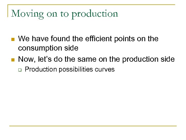 Moving on to production n n We have found the efficient points on the consumption side Now, let’s do the same on the production side q Production possibilities curves