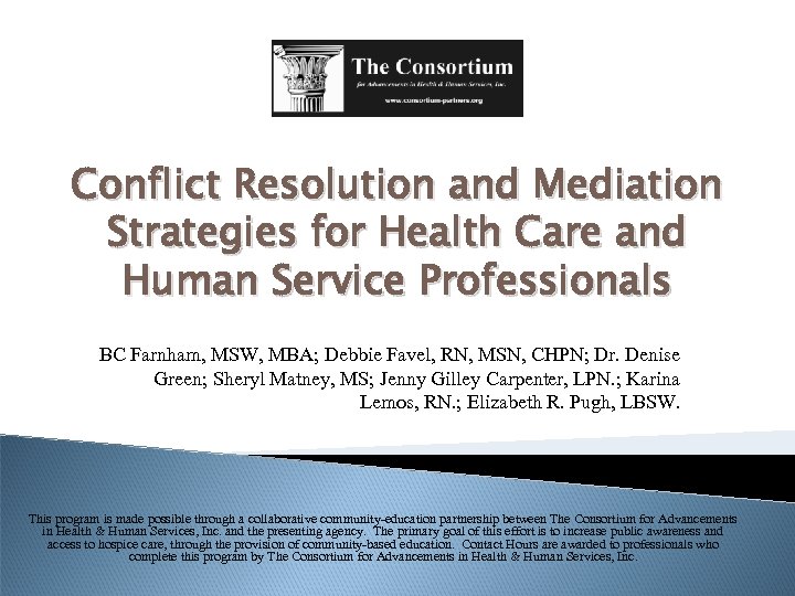 Conflict Resolution and Mediation Strategies for Health Care and Human Service Professionals BC Farnham, MSW, MBA; Debbie Favel, RN, MSN, CHPN; Dr. Denise Green; Sheryl Matney, MS; Jenny Gilley Carpenter, LPN. ; Karina Lemos, RN. ; Elizabeth R. Pugh, LBSW. This program is made possible through a collaborative community-education partnership between The Consortium for Advancements in Health & Human Services, Inc. and the presenting agency. The primary goal of this effort is to increase public awareness and access to hospice care, through the provision of community-based education. Contact Hours are awarded to professionals who complete this program by The Consortium for Advancements in Health & Human Services, Inc.