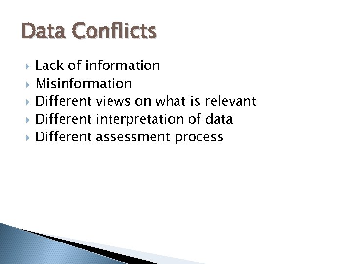 Data Conflicts Lack of information Misinformation Different views on what is relevant Different interpretation of data Different assessment process