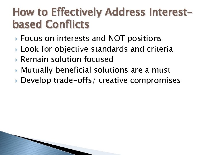 How to Effectively Address Interestbased Conflicts Focus on interests and NOT positions Look for objective standards and criteria Remain solution focused Mutually beneficial solutions are a must Develop trade-offs/ creative compromises