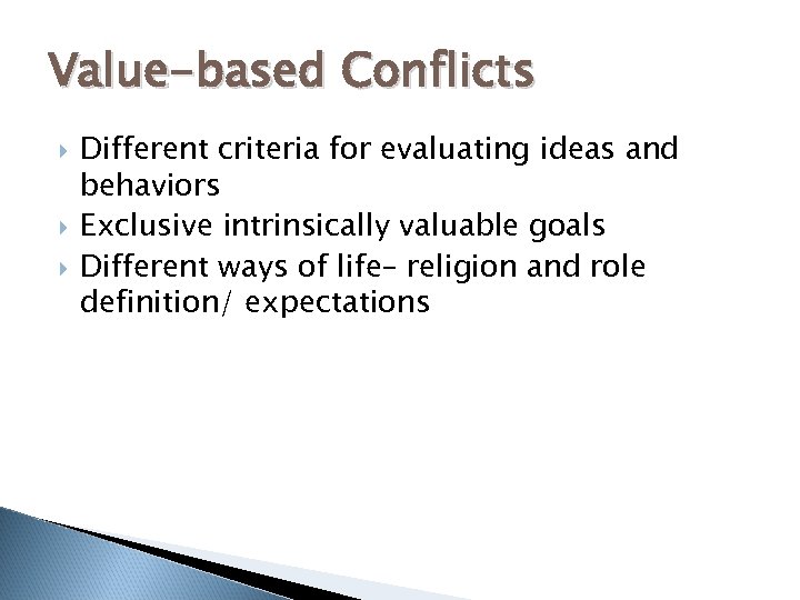 Value-based Conflicts Different criteria for evaluating ideas and behaviors Exclusive intrinsically valuable goals Different ways of life– religion and role definition/ expectations
