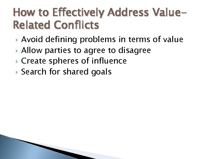 How to Effectively Address Value. Related Conflicts Avoid defining problems in terms of value Allow parties to agree to disagree Create spheres of influence Search for shared goals