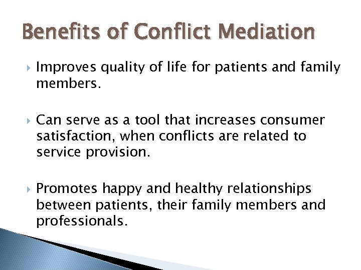 Benefits of Conflict Mediation Improves quality of life for patients and family members. Can serve as a tool that increases consumer satisfaction, when conflicts are related to service provision. Promotes happy and healthy relationships between patients, their family members and professionals.