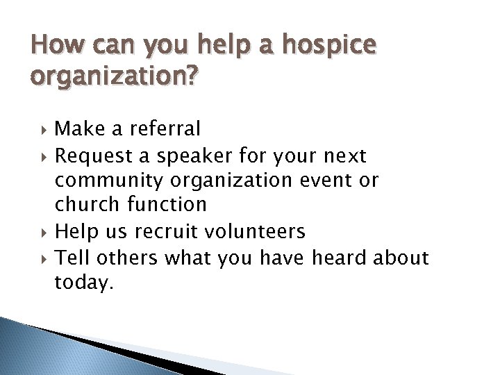 How can you help a hospice organization? Make a referral Request a speaker for your next community organization event or church function Help us recruit volunteers Tell others what you have heard about today.