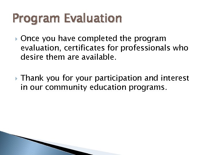 Program Evaluation Once you have completed the program evaluation, certificates for professionals who desire them are available. Thank you for your participation and interest in our community education programs.