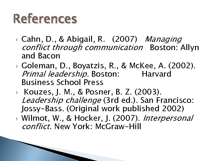 References Cahn, D. , & Abigail, R. (2007) Managing conflict through communication Boston: Allyn and Bacon Goleman, D. , Boyatzis, R. , & Mc. Kee, A. (2002). Primal leadership. Boston: Harvard Business School Press Kouzes, J. M. , & Posner, B. Z. (2003). Leadership challenge (3 rd ed. ). San Francisco: Jossy-Bass. (Original work published 2002) Wilmot, W. , & Hocker, J. (2007). Interpersonal conflict. New York: Mc. Graw-Hill