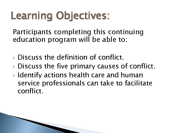 Learning Objectives: Participants completing this continuing education program will be able to: Discuss the definition of conflict. Discuss the five primary causes of conflict. Identify actions health care and human service professionals can take to facilitate conflict.