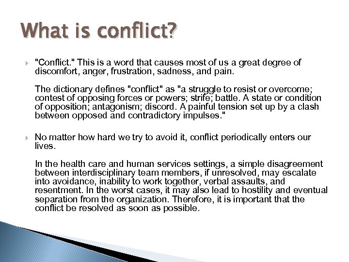 What is conflict? "Conflict. " This is a word that causes most of us a great degree of discomfort, anger, frustration, sadness, and pain. The dictionary defines "conflict" as "a struggle to resist or overcome; contest of opposing forces or powers; strife; battle. A state or condition of opposition; antagonism; discord. A painful tension set up by a clash between opposed and contradictory impulses. " No matter how hard we try to avoid it, conflict periodically enters our lives. In the health care and human services settings, a simple disagreement between interdisciplinary team members, if unresolved, may escalate into avoidance, inability to work together, verbal assaults, and resentment. In the worst cases, it may also lead to hostility and eventual separation from the organization. Therefore, it is important that the conflict be resolved as soon as possible.